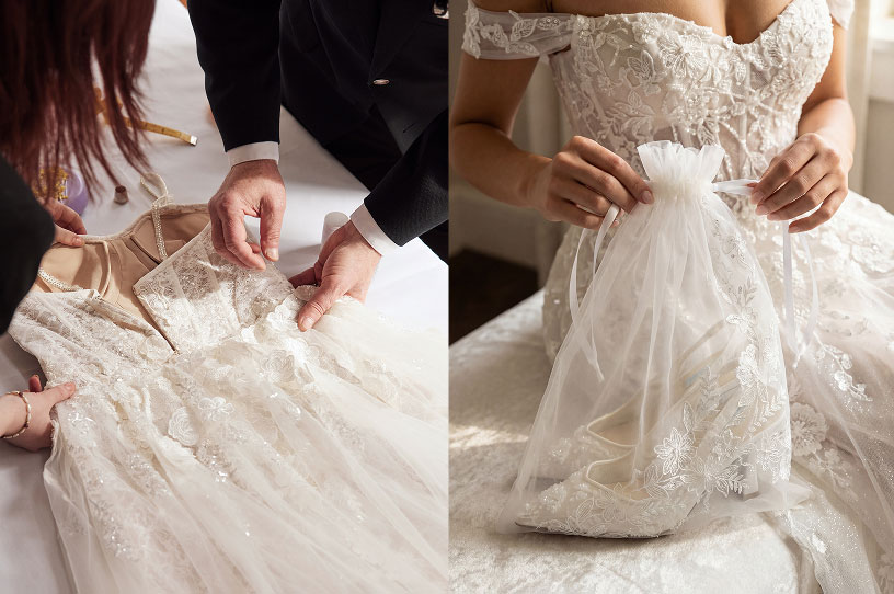 Transform fabric from your alterations (or your entire dress after the big day) into meaningful mementos handcrafted by our alterations artisans. From hair scrunchies to pet pillows, each item is thoughtfully stitched from the very fabric of your dress. Curated packages include pieces you can incorporate into your wedding and ones you can carry with you beyond the big day. For more details, ask a Dream Maker in-store.