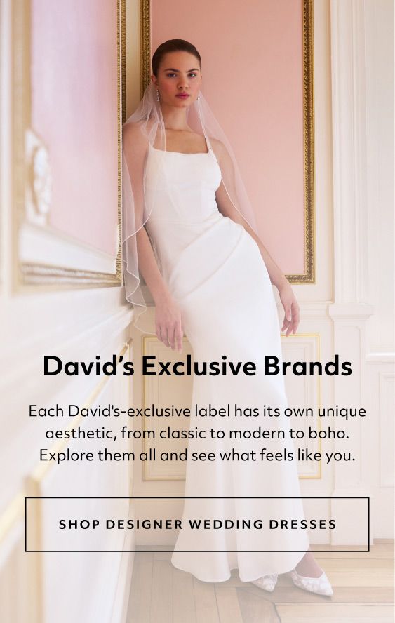 woman in wedding dress leaning against the wall promoting David’s Exclusive Brands Each David's-exclusive label has its own unique