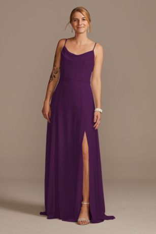 Easy to wear again and again, this chiffon bridesmaid dress will be a favorite of bridal parties and wedding guests alike for its timeless-yet-trendy style and its budget-friendly price. Features a modern cowl neckline, adjustable spaghetti straps and skirt slit.