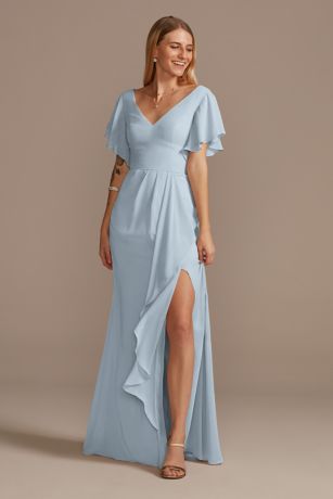 Soft flutter sleeves, a V-neckline, and a statement ruffle give this chiffon bridesmaid dress a modern boho feel.